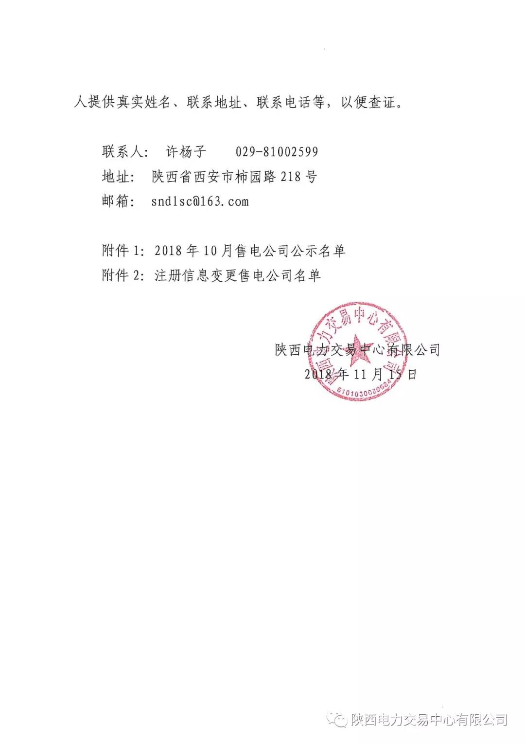 陕西电力交易中心有限公司关于公示2018年10月受理注册及信息变更的售电公司相关信息的公告