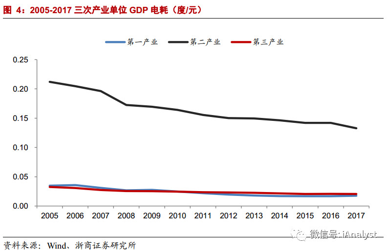 产业结构调整亦将导致单位GDP电耗趋势性下行。根据2005-2017年三次产业单位GDP电耗统计来看,基本维持下行趋势,如图4。且行业横向对比来看,第二产业单位GDP电耗约为0.13度/元,而第三产业和第一产业分别为0.02和0.017度/元,第二产业单位GDP电耗为第一产业和第三产业的6倍左右,如考虑第三产业较第二产业维持更高的增长势头,则产业结构优化亦将导致单位GDP电耗趋势性下行。