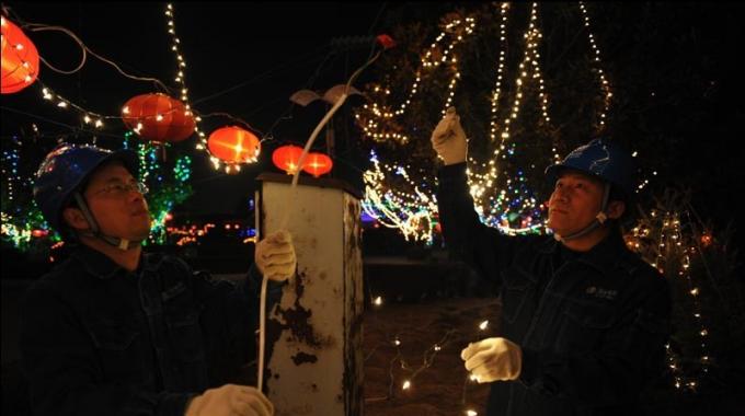 为确保全市人民度过一个光明温馨,美丽壮观的蛇年灯节,河南登封市电业局在做好安全供电的同时,还组织120名人员对15个灯展集中区域进行临时用电安全指导和隐患排查。图为2月20日,该局员工在嵩阳书院对临时用