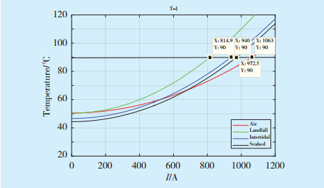 若以海底电缆通过电流大小为自变量,以海缆导体温度为自变量,海缆表面温度同样按照上述温度考虑,则可作出不同环境下导体温度与导体电流变化关系曲线(见